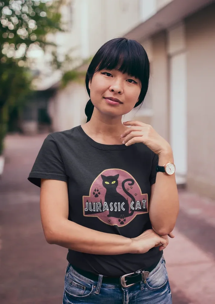 model wearing white t-shirt with black cat fun design jurassic kitten