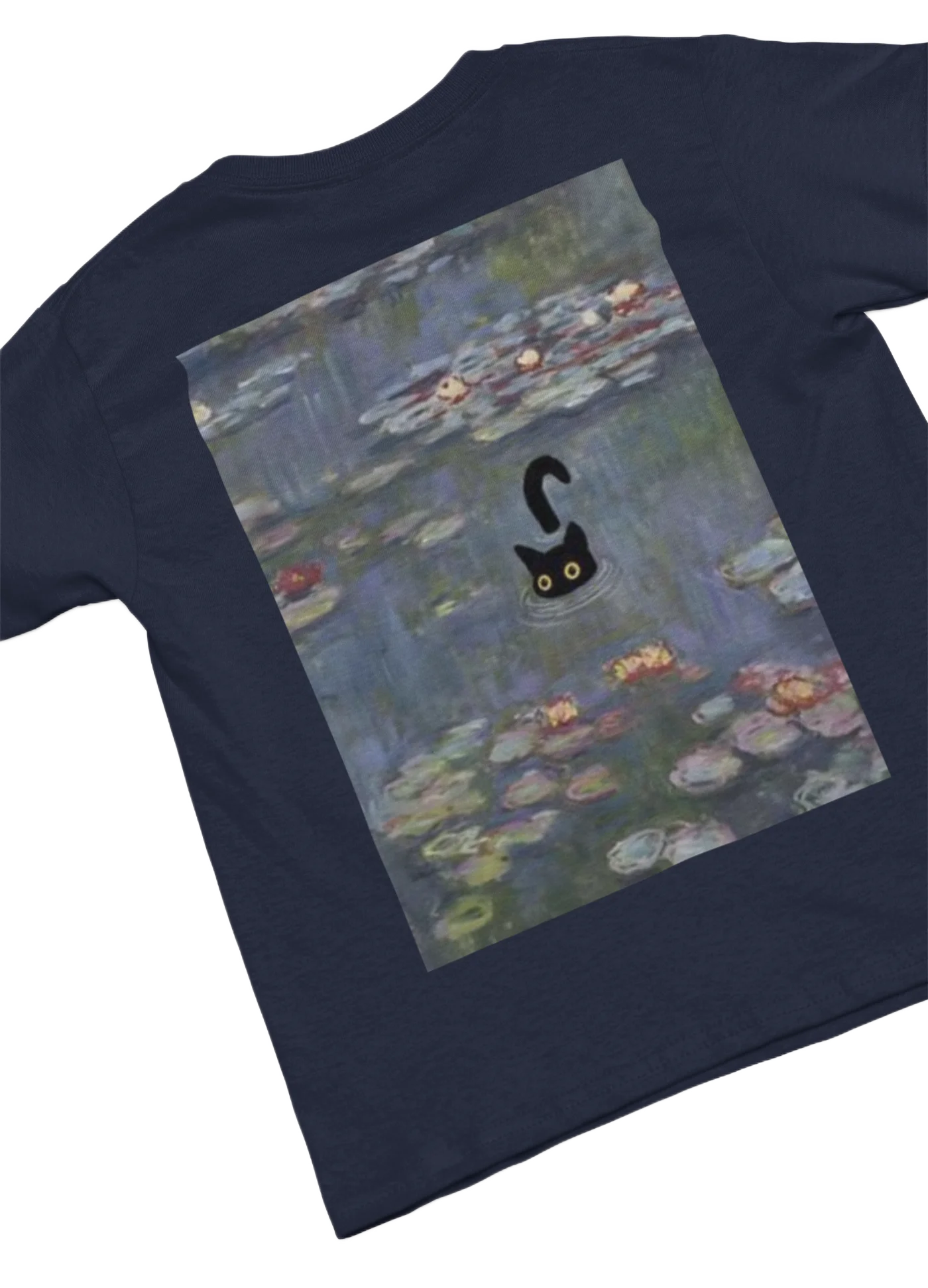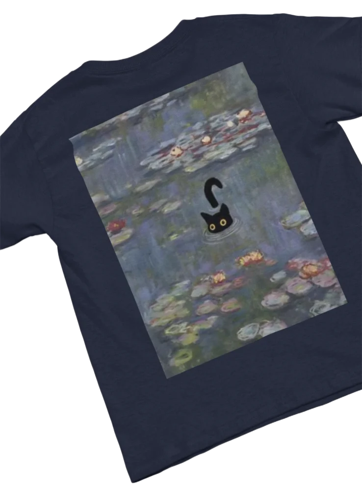 Back design, available in:model wearing white t-shirt with black cat fun design black t-shirt with black cat fun design